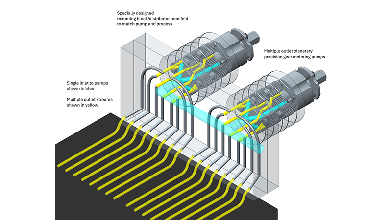 Multiple-outlet or planetary gear pumps have been commonplace for many years in other specialised industries, such as manmade fibres, but are still relatively unknown among food and drink manufacturers, although we expect them to play an important in the future of the industry. Planetary pumps provide multiple, identical fluid outlets from a single piece of equipment. Crucially, they only need one drive system to power them, so not only do they enhance processing efficiency and consistency they can also lead to significant machinery cost and space savings.
